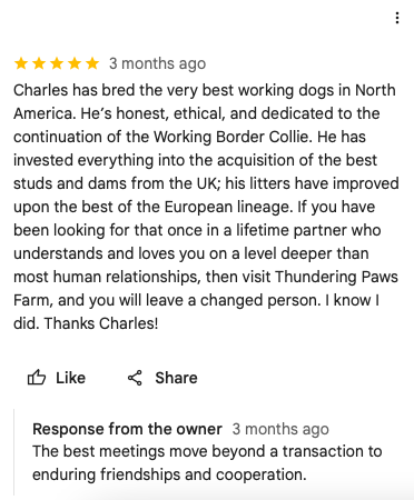 I raise some of the best working collies in the country, because I am very careful about breeding (using UK/Eire stock), do only 2-3 litters per year, and give pups extra time with their litter and adults, similar to what they would have in a natural pack. Any pups with issues are given away to good homes or are sold locally at a very sizable discount. The pups I sell to the public are not like people will find elsewhere. They are pure premium.
