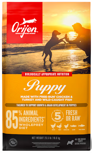 I supplement the dry Orjen kibble (ground) with Orijen canned puppy paté. Then, I mix in water to make sure they are getting enough hydration.