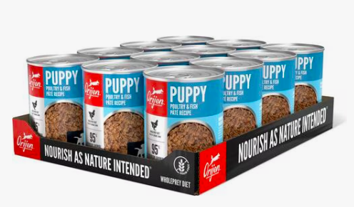 I mix in Acana Puppy Pate with the puppy kibble. It is chicken, turkey, and herring based, grain-free with 85% animal ingredients balanced with fruits and vegetables. The savory bone broth base boosts flavor and nutrition. The higher moisture content helps puppies stay hydrated.