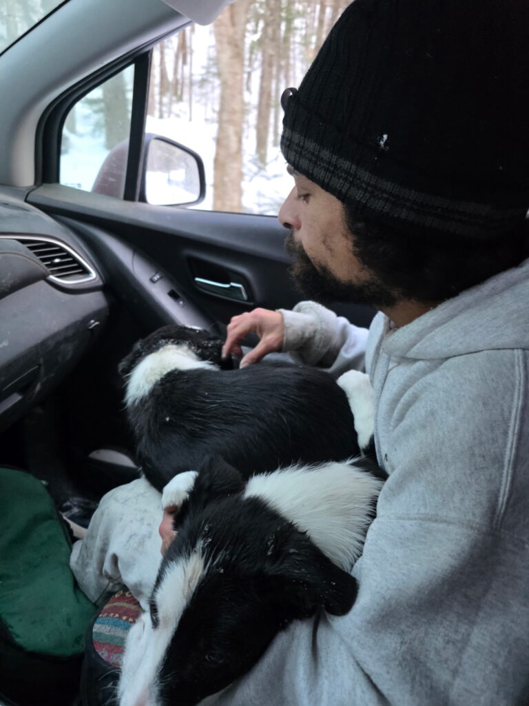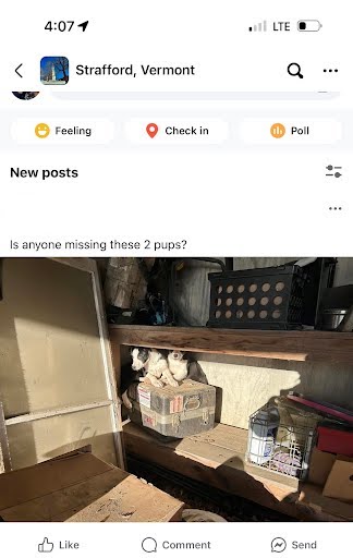 Four 13-week-old puppies went trotting down my driveway on Groundhog Day, hoping to find Punxsutawney Phil or the like. Two were found late afternoon about a mile from my house by painters working at my house –who actually got their car stuck trying to find the puppies on snowy Vermont rural roads. Two pups stayed out all night in sub-zero degree temps. The town animal control officer and I spent until after midnight tracking the missing two to no avail. Social media and Listserve posts went up immediately. The animal control officer and I were ready to canvass and alert the town, knocking doors this morning …and then, about 7:30 a.m., up walked these two missing pups, looking not too much worse for having spent the night out in the cold.