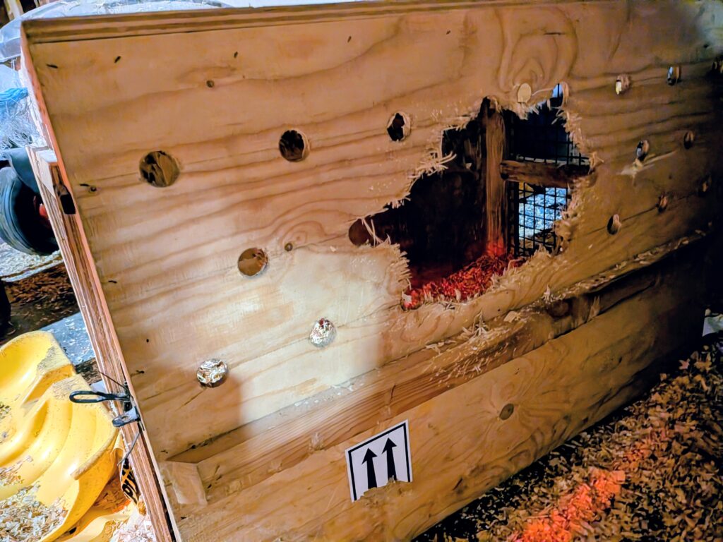 One young female did THIS while I was away doing errands. Happily, the males were locked up in steel crates. That is 5/8 in plywood she tore and ate through!