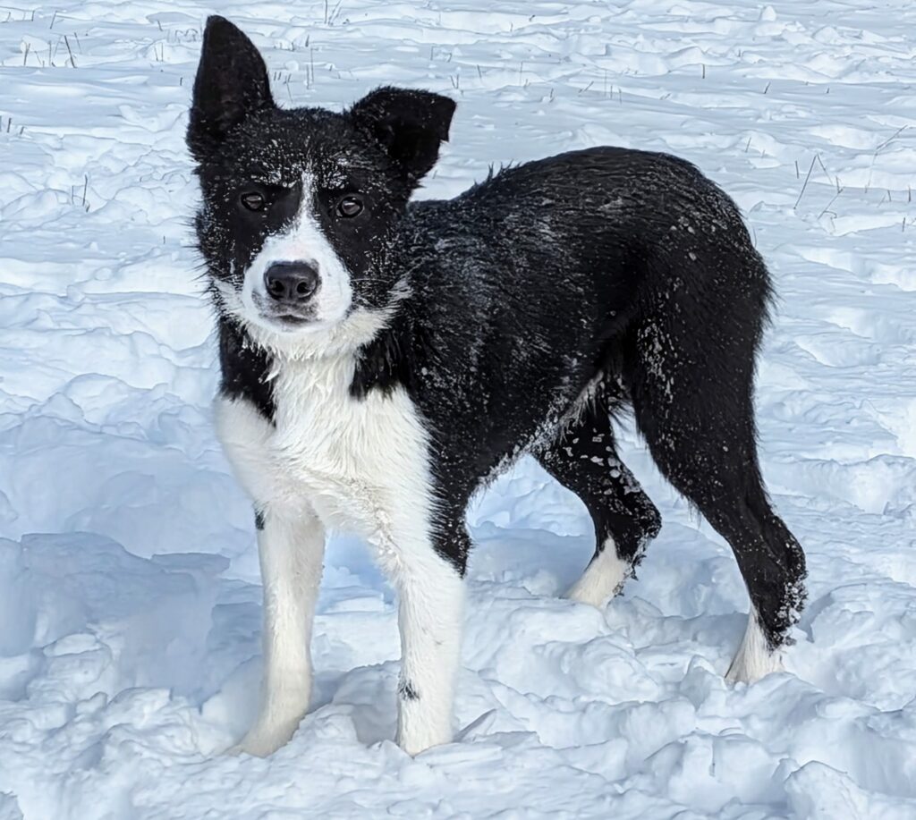 The 10 Nel x Blu pups made it to five weeks today. They appear healthy. They are certainly eating a lot. The pups are yearning for more space, but need to spend another week in the warm puppy room before going out to the cold. It’s tricky having pups at this time of year. Cold is their enemy.